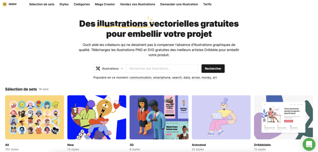 Ouch est un site où vous retrouverez plus d’une centaine d’illustrations, toutes plus originales les unes que les autres, seul petit point négatif, pour utiliser les versions PNG, il faut faire figurer un lien dessus et pour les versions SVG, il est nécessaire de posséder un abonnement pro à la plateforme.